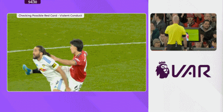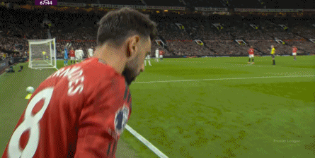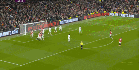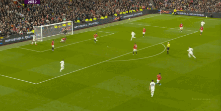 这一点还没完,第29分钟,利兹联先是在前场用身体抢断布鲁诺,获得了可以继续比赛的许可,大范围转移到右路之后,直接用45度长传打到了门前: