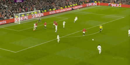 在这种情况下,曼联就尤其需要进攻端来舒缓压力,毕竟四后卫相对于三后卫的真正优势,就是在转换阶段的同一时间里可以用更多的前场球员来打反击,比如第24分钟这次抢断后的反击就打得不错,在布鲁诺的联系下,曼联立刻就聚齐了三个前场球员,但阿玛德-迪亚洛在踉跄中没有打好这次机会: